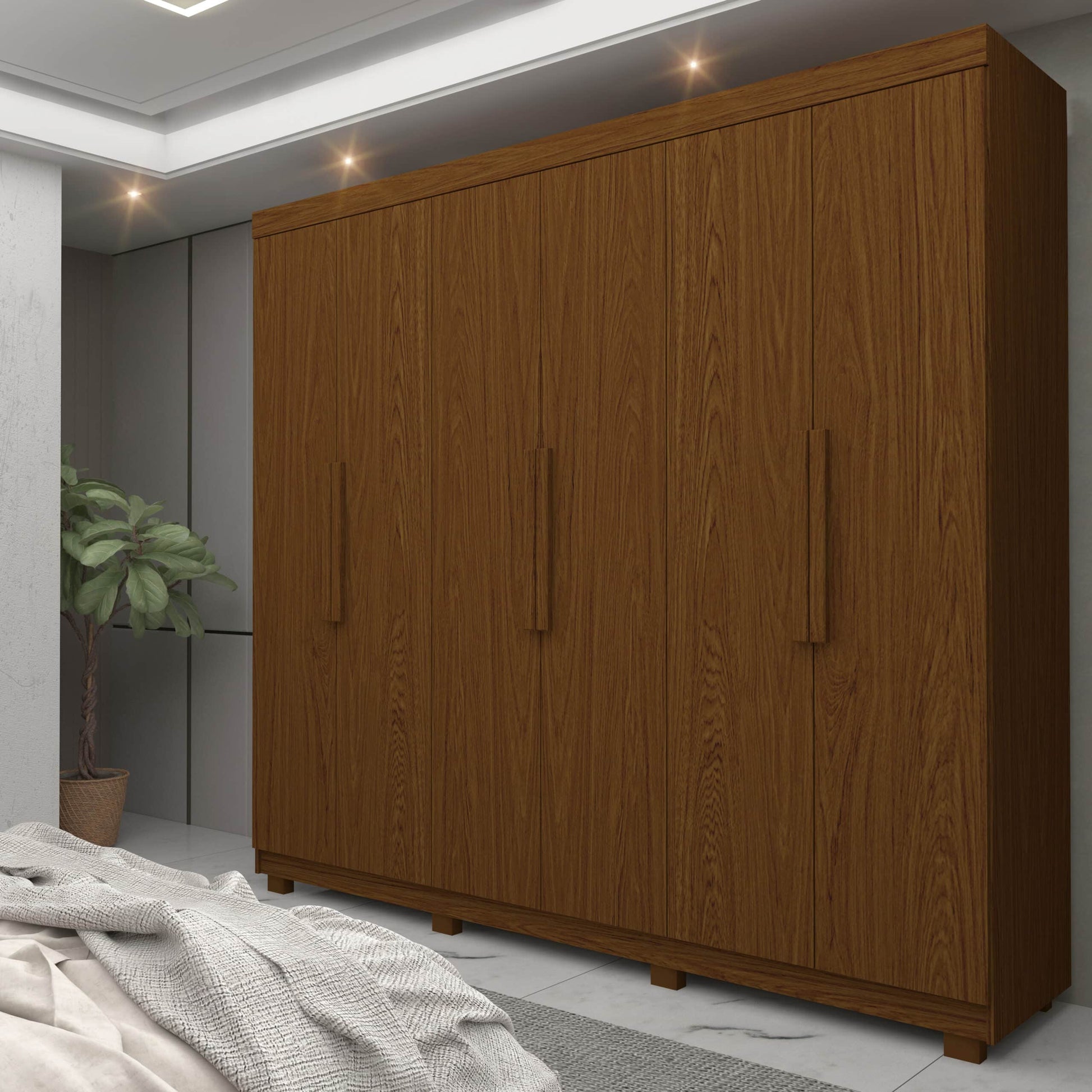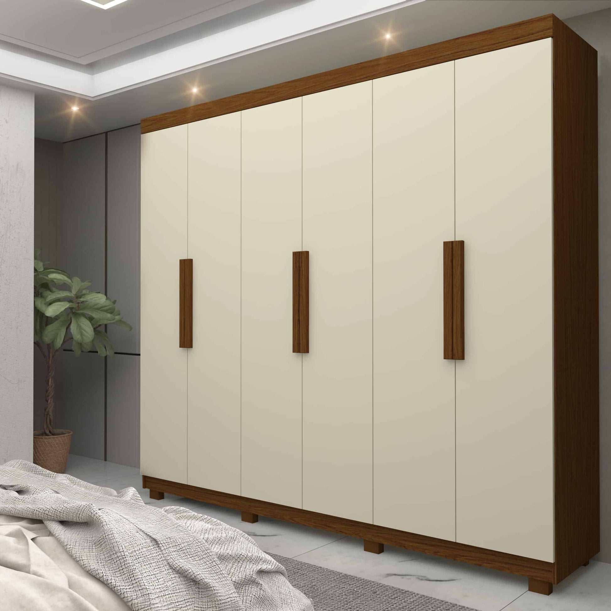 Elegante e funcional, este roupeiro possui duas gavetas com corrediças telescópicas, ampla quantidade de prateleiras e uma prática sapateira inclinada, ideal para facilitar sua rotina. Os puxadores em MDF com cava destacam o design moderno, e ele ainda vem com pés inclusos e a opção de kit espelho para um toque extra de sofisticação.
